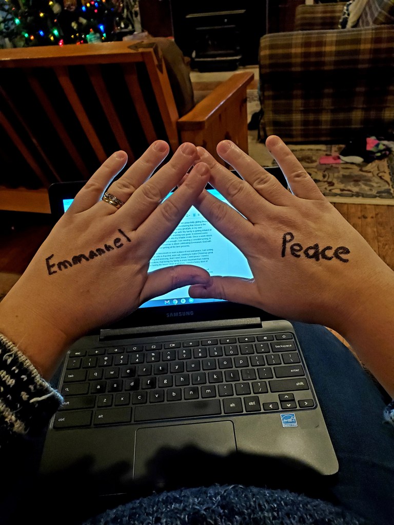 I am writing some reminders on my hands. Emmanuel. Jesus is here with us, I am saved, never alone. Peace. Christmas traditions are not as important as loving your family. Everyone would prefer a calm mom rather than a mom who has done all the stuff.